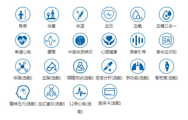 品牌名称:普瑞森 设备型号:PRS-1000A 规格尺寸:台车65×65×130cm 秤30×30×230cm 屏幕:21.5寸主控屏 标配功能:身高、体重、BMI、体温、血压、脉率、血氧、血糖、尿酸、胆固醇、腰围、臀围、心电、中医、心理。 拓展功能:人体脂肪、血脂四项、AI报告、远程诊疗。 登记方式:人脸识别、身份证识别、扫码、手工录入、(可拓展:医保卡、医保码、IC/ID卡)。 应用配置:语音引导、触摸、键盘、打印。 技术配置:Win系统、串口、蓝牙、无线、有线。 可对接:第三方平台对接、HIS、LIS、EMR、公卫平台、慢病平台、家医平台、API接口等。 适用场景